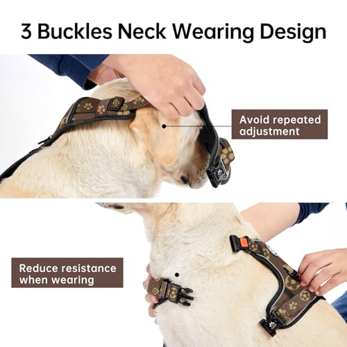 ≡ NECK WEARING DESIGN ≡ The small dog harness is equipped with 3 buckles on both neck and body position, so you can easily put it on or take it off from the neck side. No more time and effort to put on the harness from the dog’s head, and no more worries about hurting your restless dog during the process