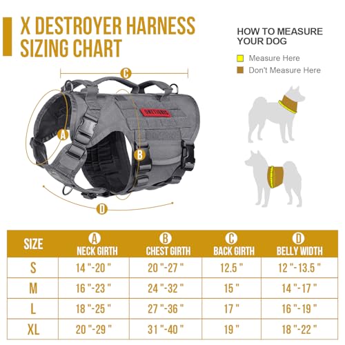 MOLLE System Dog Harness: MOLLE compatibility for add-ons with large patch panels for name patches and morale patches Light, soft padded, holds up and easy to dries quickly, ideal for trainings and outings.Upgraded structure after thorough testing to ensure a good fit and maximized comfort.Mesh breathability lining to keep your pup cool on walks and hikes.1000D Nylon construction of excellent durability and dirt/water/abrasion resistance