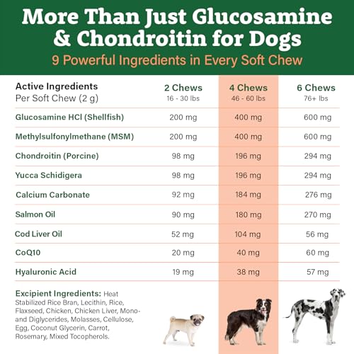We go beyond standard glucosamine for dogs. Unlike other brands that shove high amounts of glucosamine in their formulas without much thought, our team of animal nutritionists uses research and scientific studies to develop a more complete formula where glucosamine and chondroitin work alongside MSM, CoQ10, omega fatty acids, and yucca to support connective tissue and the structural integrity of joints.
