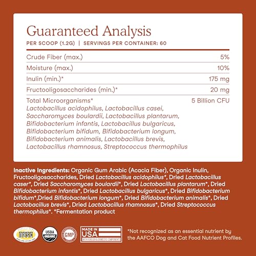 No fillers: This certified organic dog and cat probiotic is formulated with 12 strains (5 billion CFUs per scoop) and organic prebiotics (acacia, agave inulin and fructooligosaccharides) for a balanced digestive tract