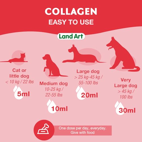 Our premium liquid collagen for pets will help your pet maintain strong, flexible and healthy joints. Known to improve the look of fur, it also improves flexibility! It increases endurance, strength and vitality, so your beloved pet can continue running and playing as much as they want. Our natural formula is liquid to maximize absorption and providesQUICK RESULTS. Our natural collagen supplement for pets does not contain parabens, dairy products, wheat, gluten, yeast or corn. It is made with premium ingredients while being sugar free, gluten free, GMO-free and all natural. Once opened, please keep refrigerated. The product can be consumed until the expiry date. Land Art’s products are made in Canada, so you can feel confident using our products. We also assure your purchase with a full refund and complete confidence regarding your expenditure. If required, please contact Amazon customer service.