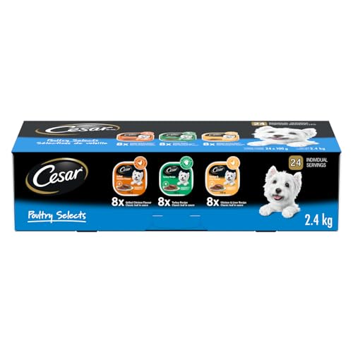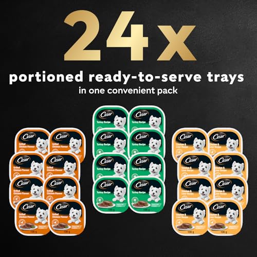 FOR SMALL BREED ADULT DOGS: Contains one (1) 24-count case of 100g trays of CESAR Adult Wet Dog Food Classic Loaf in Sauce Poultry Selects Variety Pack: (8) Grilled Chicken Flavour (8) Turkey Recipe (8) Chicken & Liver Recipe
