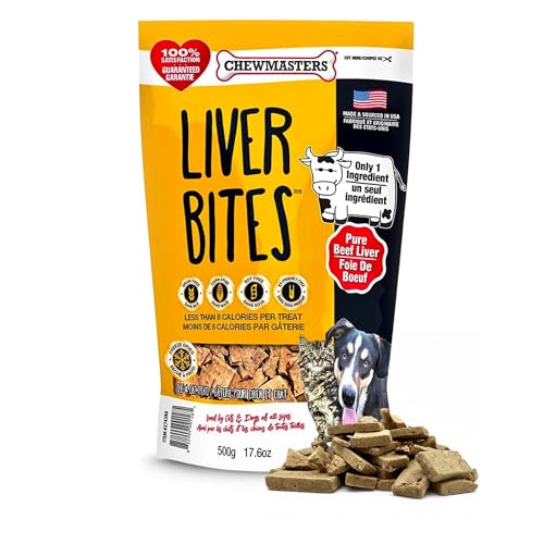 Chewmasters beef liver bites freeze-dried dog treats, 17.6-oz bag, pure, natural and nutritious Chewmasters liver bites are 100% pure beef liver treats for your pup – only one ingredient. You can feel good treating your pet to a natural treat that’s low fat and high in protein. They are highly digestible. This wholesome treat is also ideal as a training aid. Always supervise your pet when treating these healthy chews.