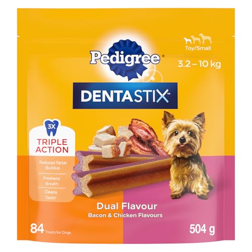 PEDIGREE DENTASTIX Oral Care Dual Flavour Bacon & Chicken Adult Dog Treats – for Mini Breeds – Reduces Plaque and Tartar Buildup – 84 Sticks 504g Pouch