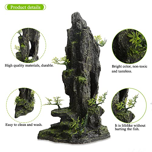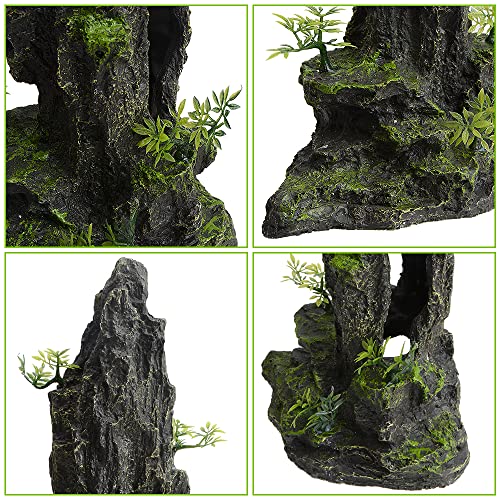 PENCK Aquarium Mountain View Stone Ornament Large and Tall Fish Tank Decorations Resin Rock Hiding Cave Aquarium Accessories Decor Landscape with Small Artificial Plants – 14.4inch High