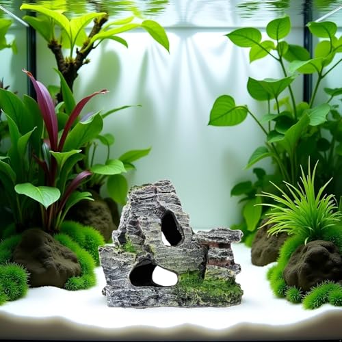Resin Aquarium Mountain Decor with Moss Rock Cave – Multi-Level Terrain for Fish Tank Landscaping, Natural-Looking Rockery Design with Hidden Cave and Crevices for Shrimp, Reptile Habitat Aquascaping​