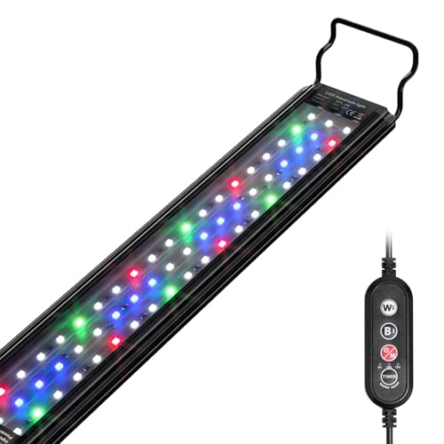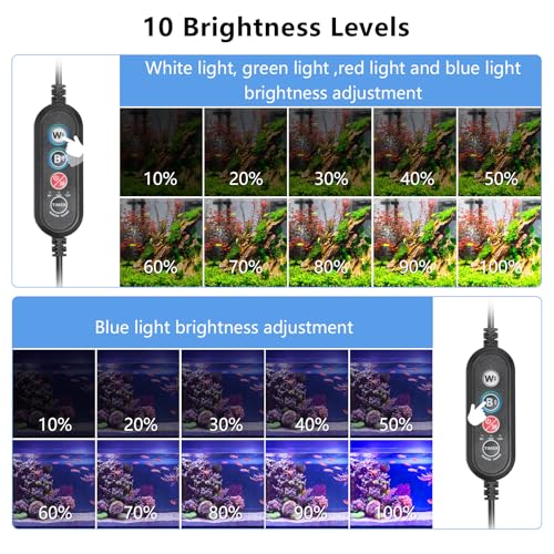 10 Intensity Levels: The LED aquarium lighting has 10 intensity levels (10%, 20%, 30%, 40%, 50%, 60%, 70%, 80%, 90% and 100%), press the W button: control the brightness of white green and red light, press the B button (only blue light is on): control the brightness of blue light.
