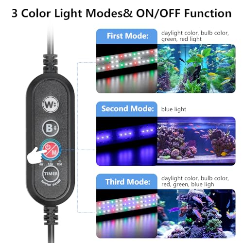 3 Lighting Modes: Short press the M button on the aquarium LED light to switch between 3 modes. Press and hold the M button for 3 seconds to turn off all lights. First mode: daylight color, bulb color, green, red light; second mode: blue light; third mode: daylight color, bulb color, red, green, blue light (convenient to use).