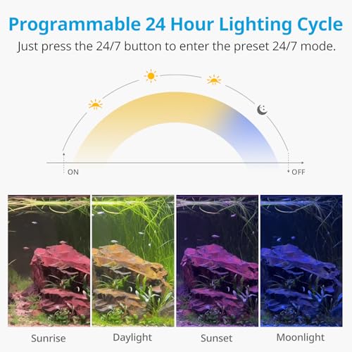 EASY-TO-USE 24/7 MODE: The fish tank light can perfectly simulate the natural 24-hour cycle of sunlight. Just press a button, hands-free simulating fire red sunrise to blue starry night