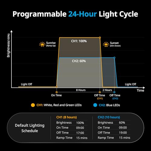 Provides more options to adjust the auto On/Off time and brightness. Featured 15 or 30-minute ramp-up and dim-down to simulate natural sunrise and sunset, waking the fish up in soft lighting and ensuring a good sleep with complete off at night