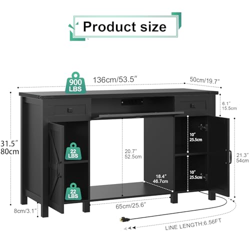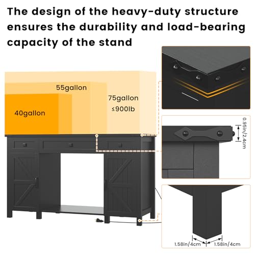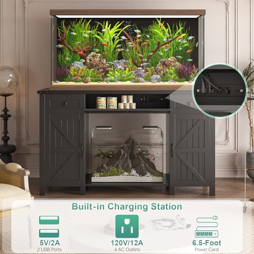 55-75 Gallon Aquarium Stand With Charging Station, Farmhouse Fish Tank Stand, Reptile Tank Stand Terrarium Stand with Drawer and Cabinet Storage, Sturdy Heavy Duty 53.5″×19.7″ Tabletop – Black
