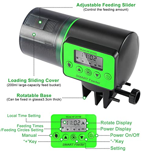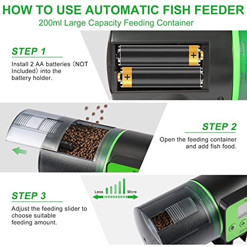 🐠【Large Food Capacity & Moisture Resistance 】- With a capacity of 200ml, its large size holds enough food to keep your fish fat while you’re away. Hatch style feed door is completely adjustable, allowing you to decide how much food is dispensed at each meal. This fish feeder keeps fish food dry, which will not get wet or jammed. Widely applicable for a variety of foods like pellets, flakes, strips or crumbles, etc.