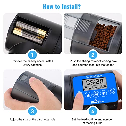 【Customize Feeding Time】The timer fish feeder has a built-in digital control system. You can set the feeding time and frequency according to your fish’s eating habits(1-3 meals per day, 1-3 times per meal). The fish feeder will feed the fish at scheduled every day, helping pets develop good eating habits. BlueFire fish feeder will take good care of your pet fish when you are not at home.