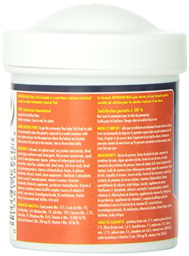 Nutrafin Max Baby Fish Formula is a nutritious highly palatable formula naturally colored by its ingredients in a high value format containing 45-Gram of ultra fine granules for many types of baby freshwater tropical fish. Enriched with calcium, earthworm, garlic and spirulina this baby fish food will support quick growth levels and strong conditioning of young fish. It also contains multi-vitamins and Advanced Yeast Extract for digestive system support and more for the ultimate in baby fish nutrition.