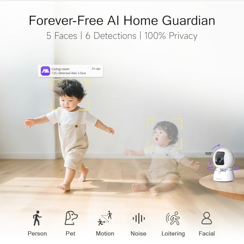 Home Camera w/ Free Al detections: Finally, a home security camera indoor that knows who’s who! Stores 5 family faces locally w/ bank-encryption & 0 cloud uploads. Recognize family/strangers/pets/baby crying/smoke/gas alarms with no subscription fees. Spend an extra $20 Now and save $100 Later! Why pay $10/mth when privacy is FREE