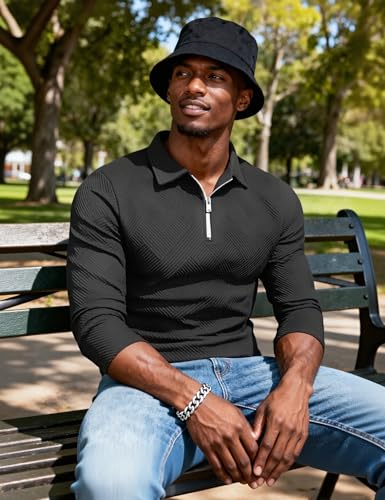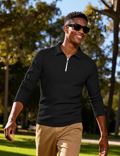 UOUA Men’s Polo Shirt Quarter Zip Tops Soild Casual Geometric Texture Long Sleeve Sweaters Pullover Golf Sweatshirts