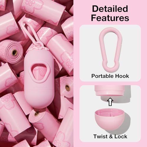 VETRESKA Dog Poop Bag Dispenser with Cherry Blossom Scented Bags, Leak Proof, Extra Thick Waste 1 Count Holder and 105 Bags for Walking Cats Litter, Pink